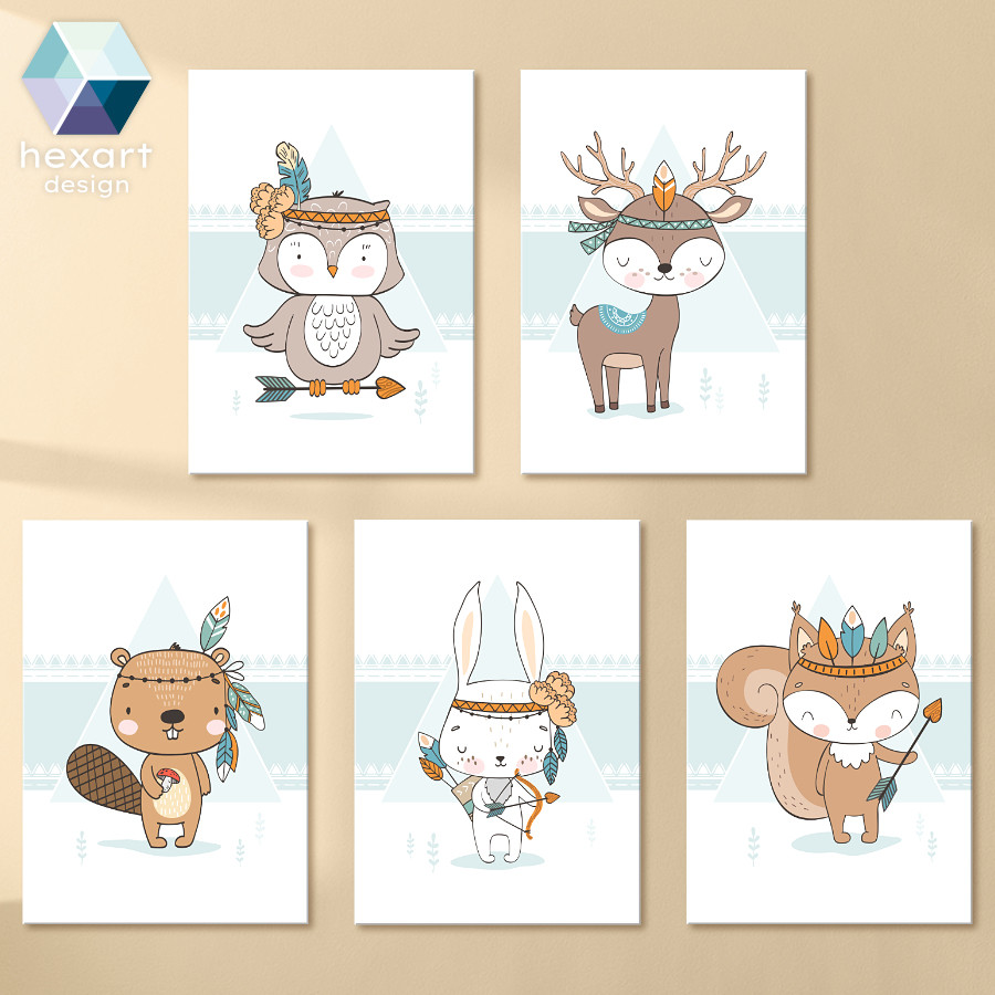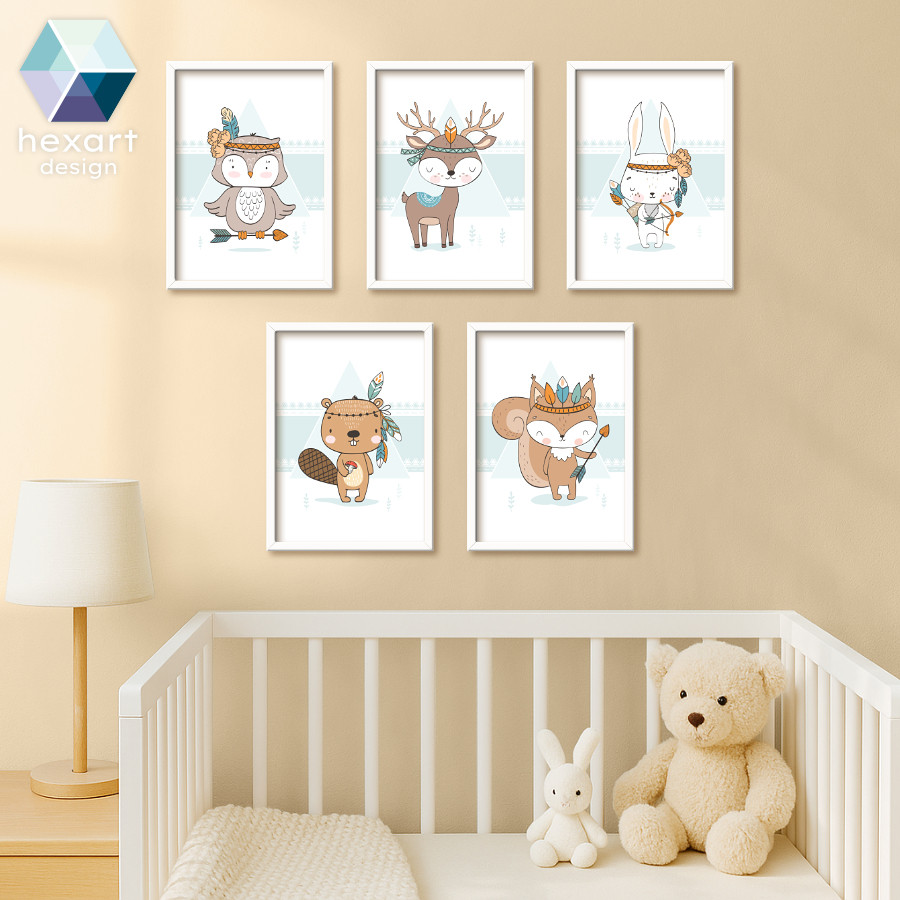 Tedd varázslatossá a babaszobát az 5 darabos fali dekoráció szettel! A menta árnyalatú háttér egységes és harmonikus alapot ad a bájos erdei állatoknak (bagoly, szarvas, nyuszi, hód és mókus). Az indián kiegészítőkkel, ékszerekkel és tollakkal díszített cuki állatok játékos és különleges hangulatot teremtenek. Tökéletes választás, ha szeretetteljes és vidám légkört álmodsz gyermeked szobájába.