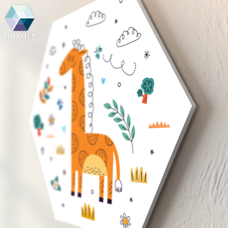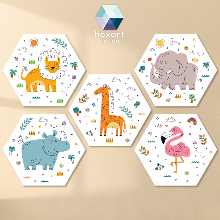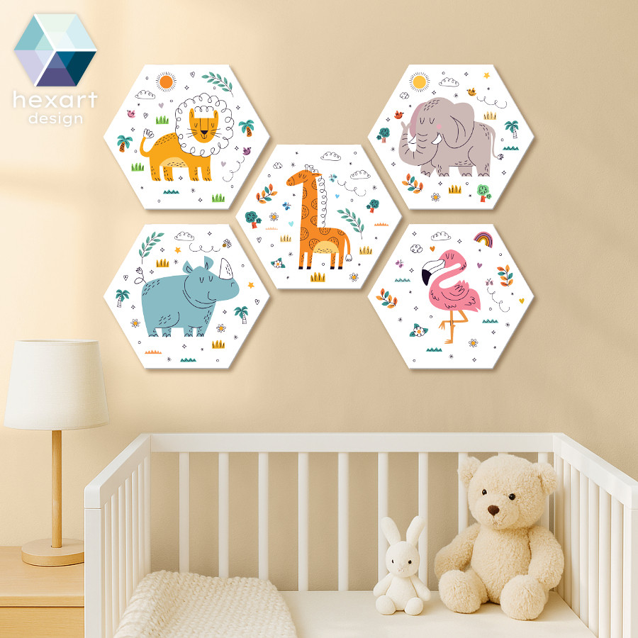Dobd fel a babaszoba hangulatát ezzel az egyedi, 5 darabos hatszög formájú fali dekoráció szettel! A fehér háttéren, finom grafikai elemekkel kiegészített egységes design keretében jelenik meg az oroszlán, zsiráf, elefánt, orrszarvú és flamingó. Az élénk színű, bohém és kedves állatok vidámságot és játékosságot sugároznak, miközben harmonikusan illeszkednek bármilyen babaszoba berendezéséhez. Tökéletes választás, ha különleges és szeretetteljes hangulatot szeretnél teremteni kisbabád szobájában.