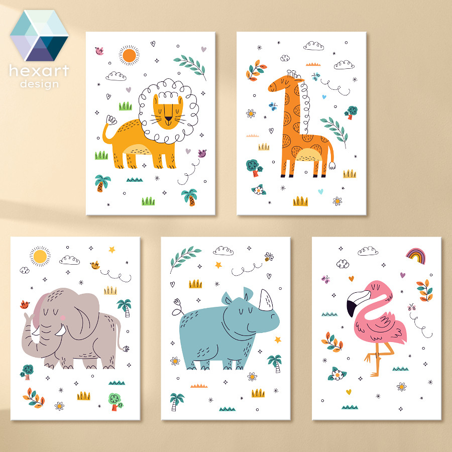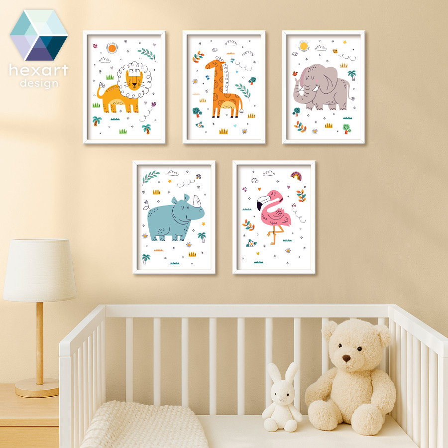 Dobd fel a babaszoba hangulatát ezzel az egyedi, 5 darabos fali dekoráció szettel! A fehér háttéren, finom grafikai elemekkel kiegészített egységes design keretében jelenik meg az oroszlán, zsiráf, elefánt, orrszarvú és flamingó. Az élénk színű, bohém és kedves állatok vidámságot és játékosságot sugároznak, miközben harmonikusan illeszkednek bármilyen babaszoba berendezéséhez. Tökéletes választás, ha különleges és szeretetteljes hangulatot szeretnél teremteni kisbabád szobájában.