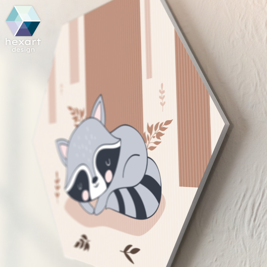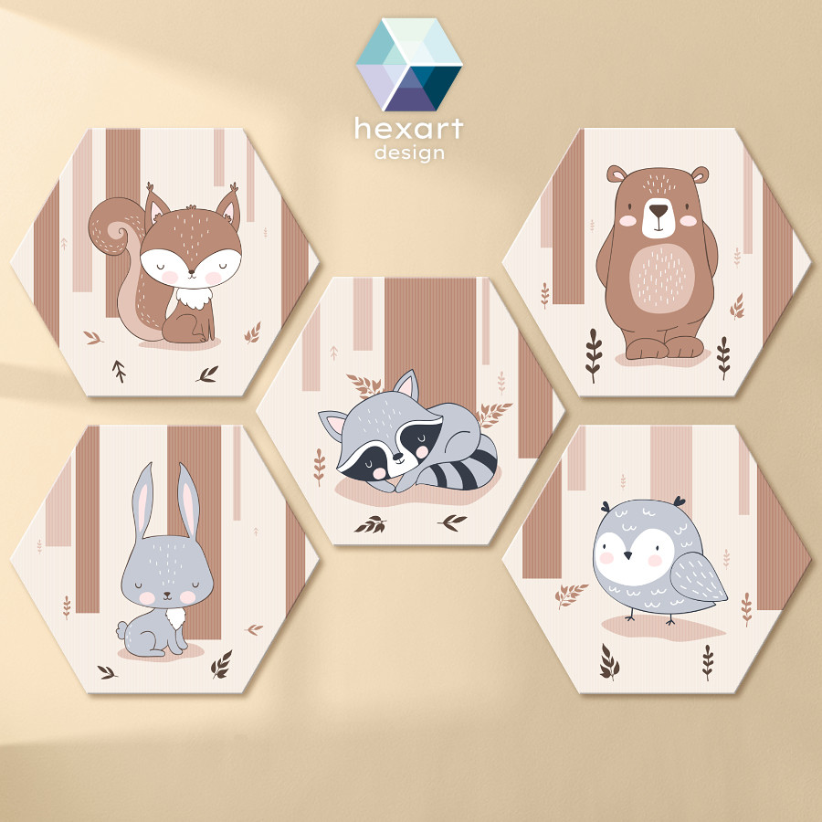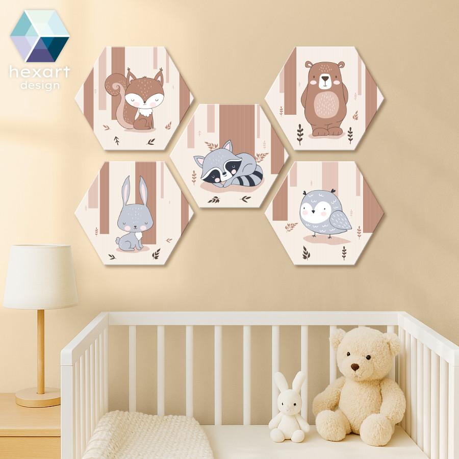 Dobd fel a babaszoba hangulatát ezzel az 5 darabos, hatszög formájú fali dekoráció szettel! A kedves mókus, mosómedve, nyuszi, medve és bagoly egységes barna háttéren, visszafogott, letisztult színvilágban jelennek meg. Az erdei állatok barátságos, harmonikus kisugárzása meghitt hangulatot teremt, amely bármilyen berendezéshez illik. Ideális választás, ha természetközeli és szeretetteljes légkört álmodsz kisbabád szobájába.