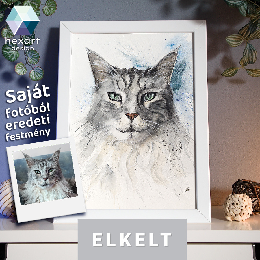 Megrendelésre készült Maine Coon portré festmény Éjfél cica emlékére. Akvarell technikával készült A4-es méretben.