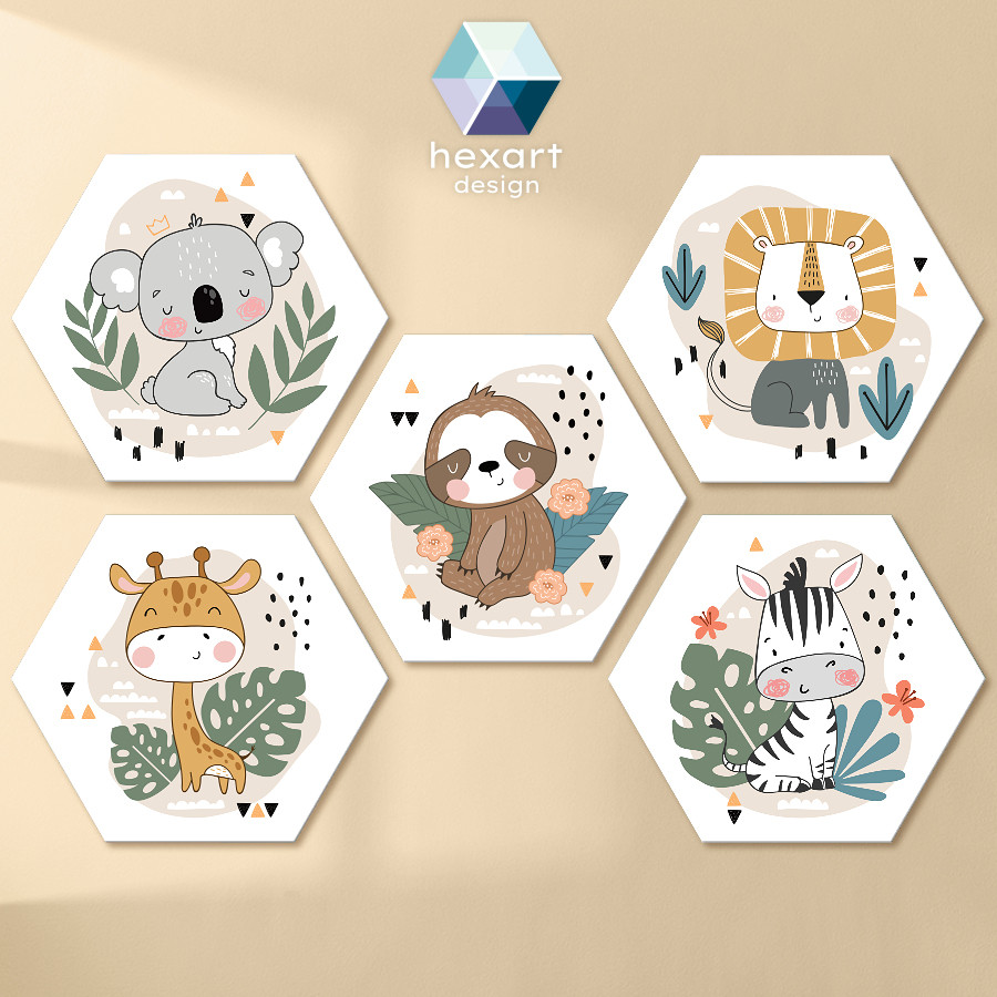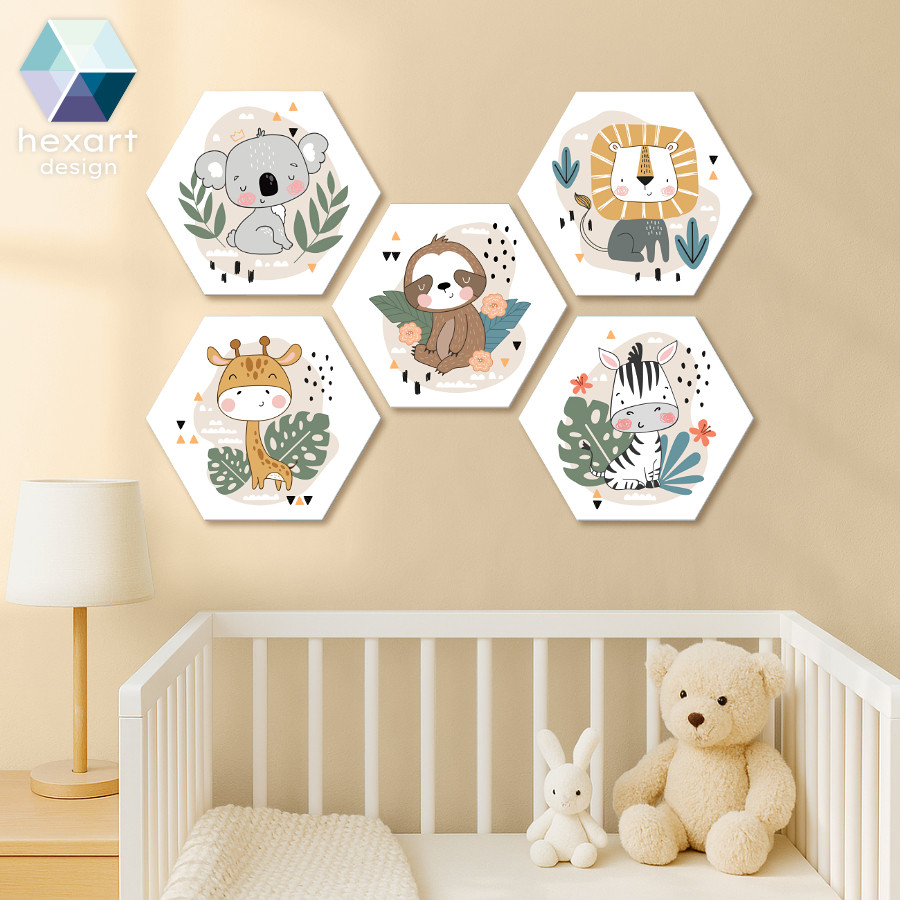 Varázsold különlegessé a babaszoba hangulatát ezzel az 5 darabos, hatszög formájú fali dekoráció szettel! A visszafogott fehér háttér és a finom grafikai elemek elegáns keretet adnak a kedves koala, lajhár, oroszlán, zsiráf és zebra dekorációjának. Az egységes, mesés design harmóniát és bájt sugároz, így bármilyen enteriőrbe könnyedén illeszkedik. Tökéletes választás, ha nyugodt, szeretetteljes légkört szeretnél teremteni kisbabád szobájában.